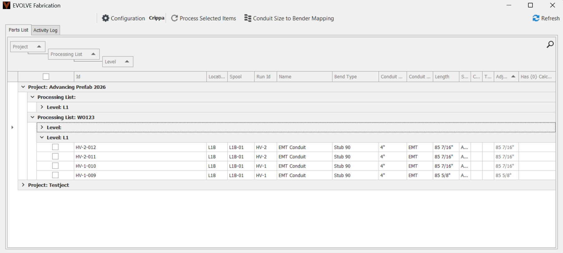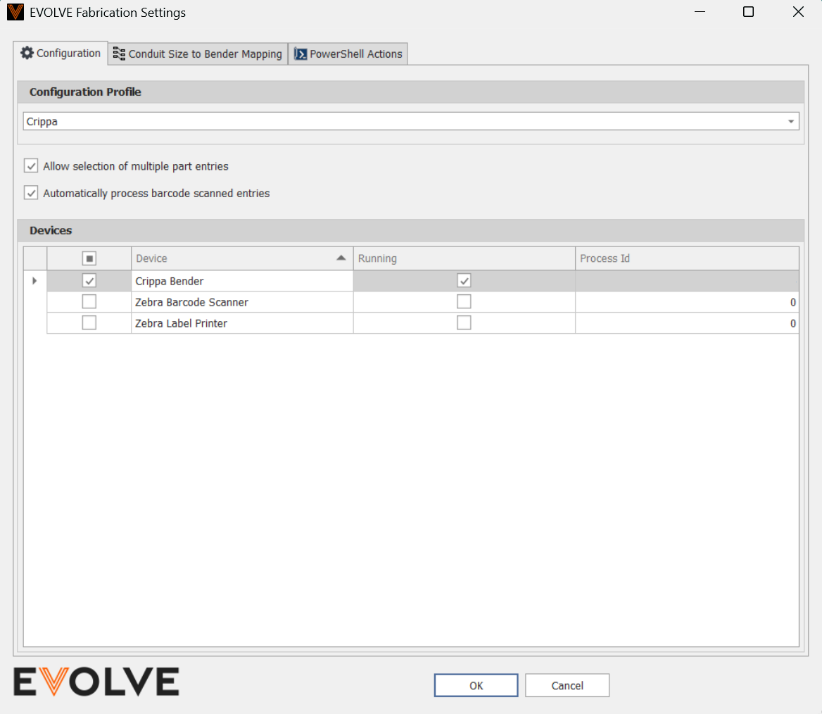 EVOLVE Fabrication Client is a Windows application for interlinking data from design software to manufacturing. By interfacing with several devices automation of part production and quality inspection can be accomplished. By including devices like label printer(s) and barcode scanner(s) efficient operational integration to machines like CNC tubing bender(s) and automated saws can be accomplished. It provides a grid-based interface for part selection, device management, and automation workflows.