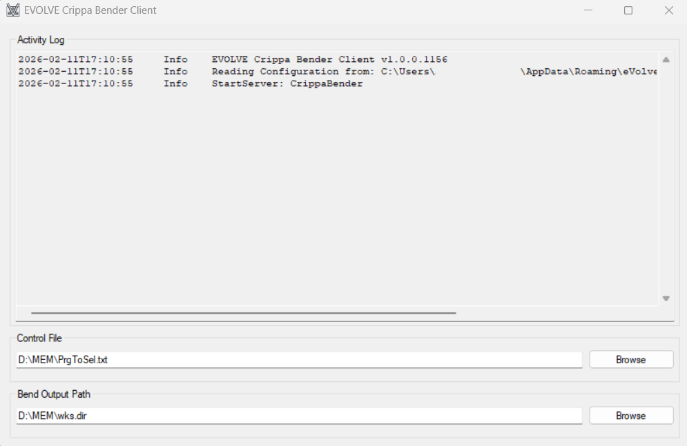 Crippa Bender Client is a Windows application for managing and outputting bend data to a Crippa Bender machine. It provides a simple interface for configuring output paths, monitoring activity, and integrating with the EVOLVE Fabrication Client.