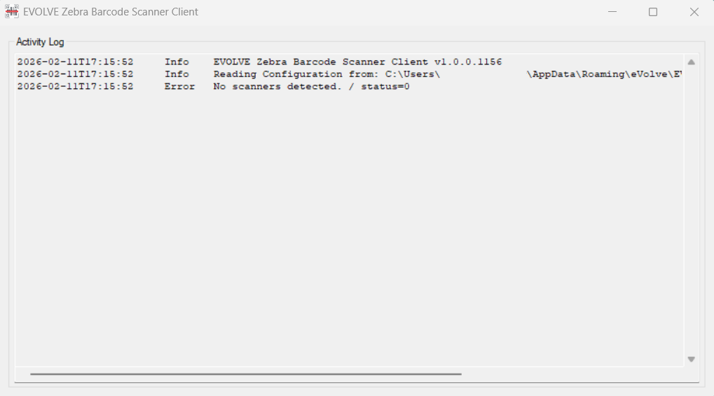Configuration is saved per user in %APPDATA%\eVolve\Zebra Barcode Scanner Client\Configuration.xml. Any manual edits to this file must be performed while the application is completely closed.