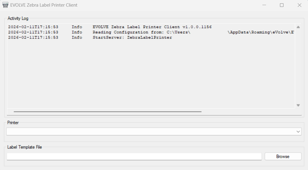 Configuration is saved automatically and persists per user in %APPDATA%\eVolve\Zebra Label Printer Client\Configuration.xml. Any manual edits to this file must be performed while the program is closed.
