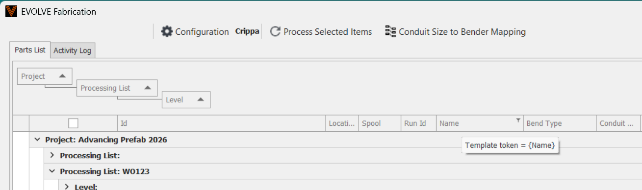 - Token values are found by hovering over a column header of the part grid of the EVOLVE Fabrication Client. For example, hovering over the Length column would show a token value of